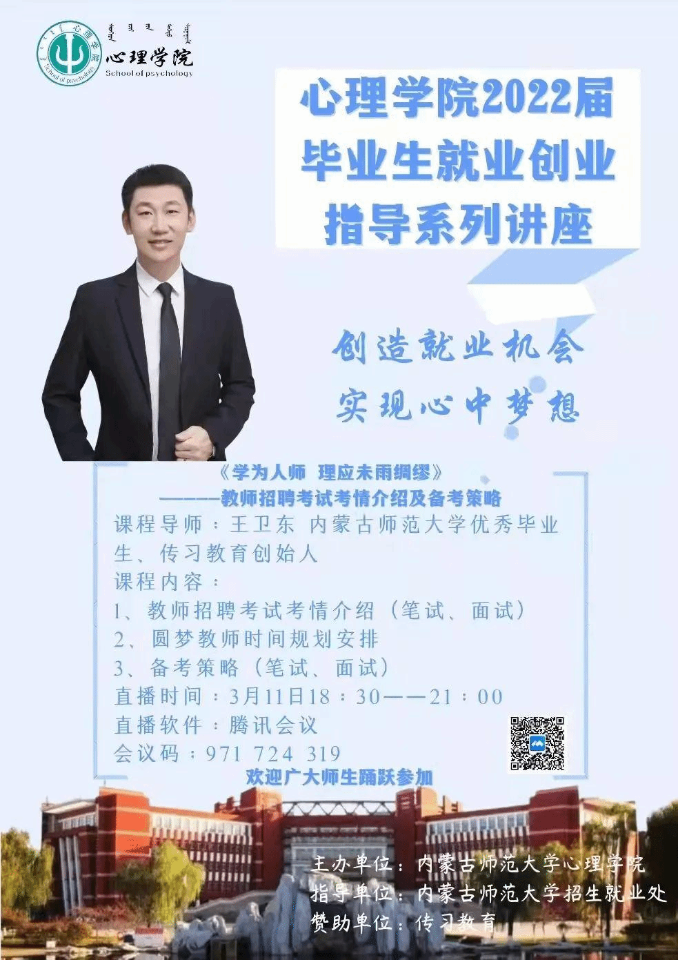 为贯彻党中央、国务院“稳就业”“保就业”决策部署,落实学校推进毕业生就业工作要求,促进买球毕业生高质量就业。2022年3月11日,买球体育官方网站特邀请优秀校友、传习教育创始人王卫东为同学们开展“《学为人师 理应未雨绸缪》--教师招聘考试考情介绍及备考策略”专题讲座,学院党委副书记副院长张晓阳参会,学生工作与就业指导办公室主任张金钟主持。