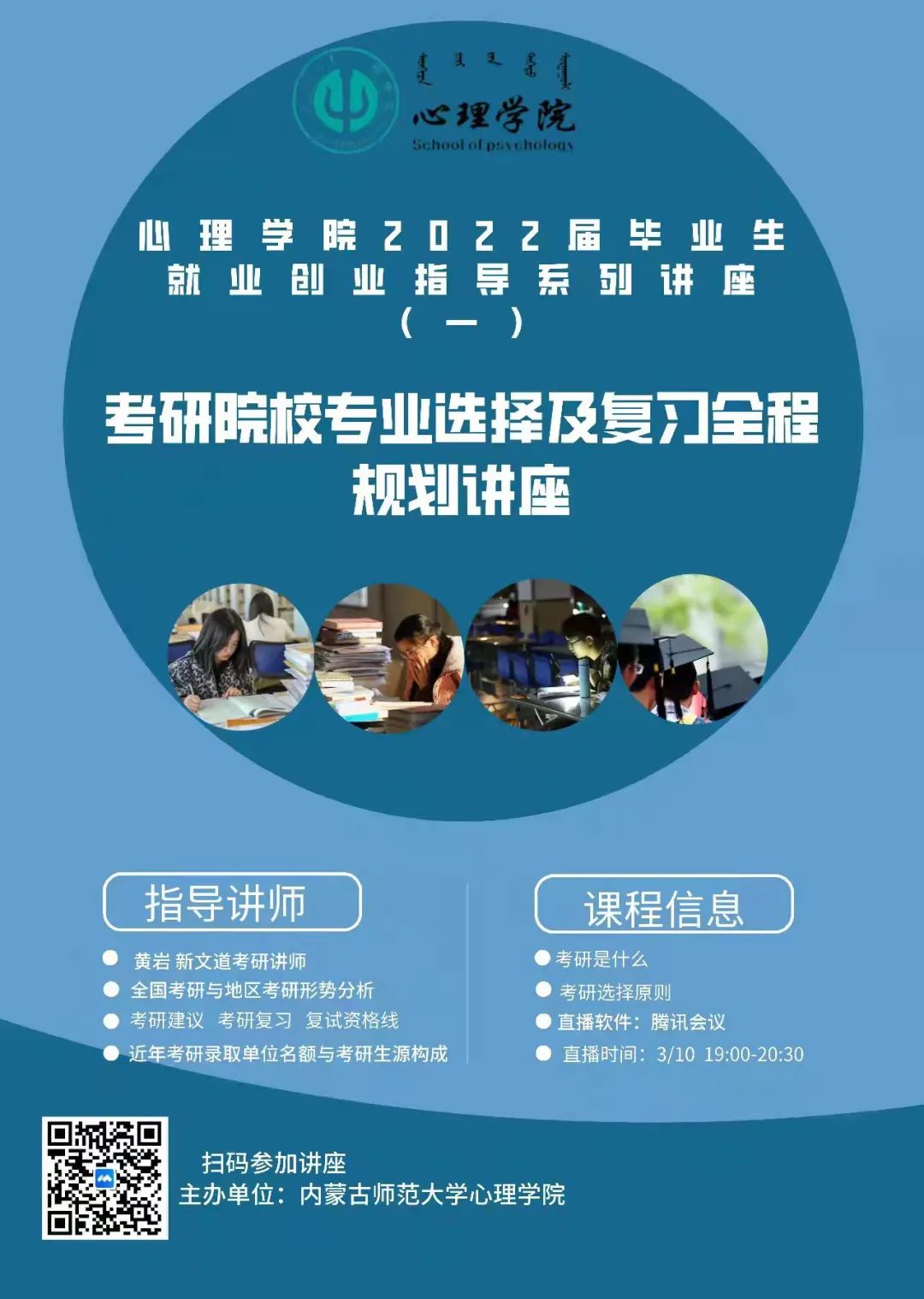 为丰富2019、2020级学生对考研的相关知识,激发学习热情、增强考研信心,买球体育官方网站于2022年3月10日晚19点开展了2022届毕业生就业创业指导系列讲座(一)——考研院校专业选择及复习全程规划讲座。