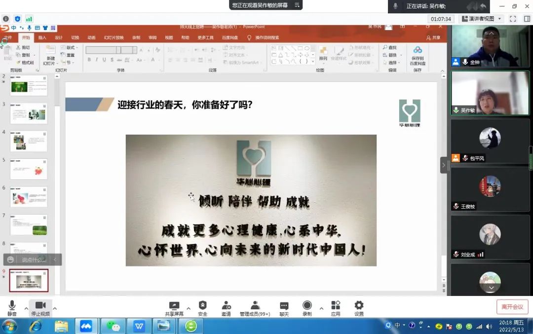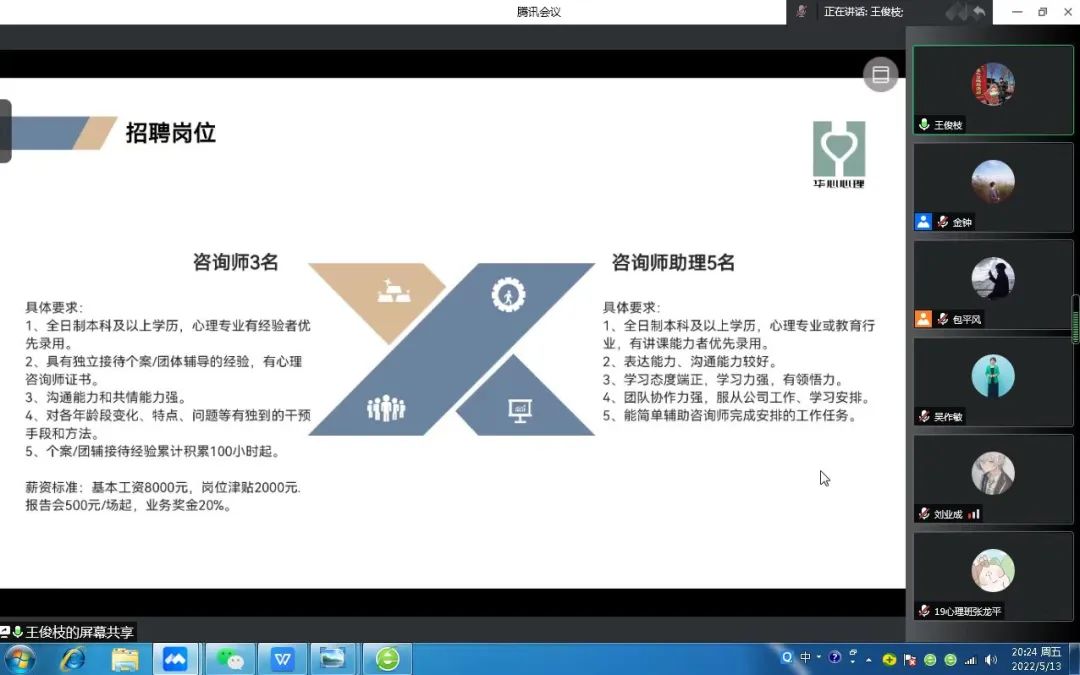 华心集团负责人侯昺剑为同学们介绍了公司背景、企业文化及主营项目,带领同学们云参观了华心心理中心;华心心理中心主任吴作敏针对学科专业特点,介绍了心理咨询师的就业前景和就业现状;华心集团综合办公室主任王俊枝进行招聘要求、薪资待遇、岗位名额等内容介绍;华心心理中心咨询师助理赵佳恩和王飞一分别结合自身经历分享了就业选择及华心心理的工作氛围。同时,几位老师多角度、全方位地对同学们的疑问作出了详细解答。