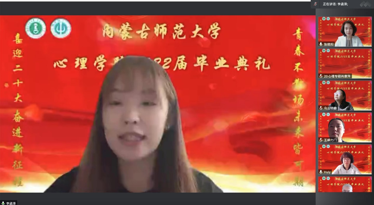 2019级发展与教育心理学硕士研究生乌妮尔同学作为研究生代表发言。她通过回顾在学校学习生活的点滴记忆,表达对母校的感恩、对学院老师的不舍和依恋。她代表毕业生表态:要立志做无私奉献、锐意进取的追梦人,以奋斗有我、强国有我、功成有我的姿态,激荡起新时代的澎湃春潮。